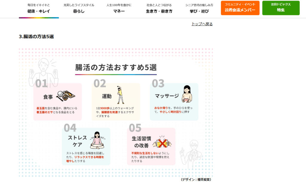 「腸」をトピックとして挙げつつ、最終的には、食事をしっかりとって、体を動かして、ちゃんと睡眠をとるという基本の健康のためのトピックを挙げるのに、たまたま「腸」が使い勝手がよかった体内器官で、それにある程度こじつけているだけなんだという事実も理解できます。