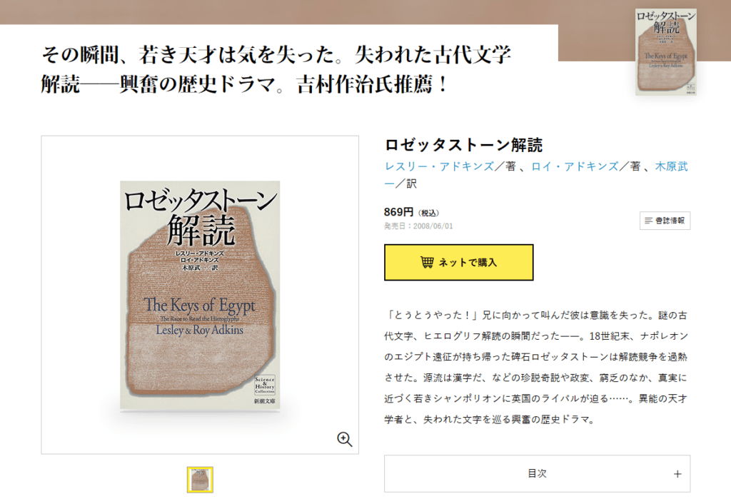 レスリー・アドキンズ、ロイ・アドキンズ、木原武一/訳 『ロゼッタストーン解読』 | 新潮社 (shinchosha.co.jp)