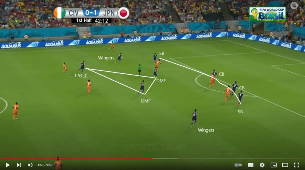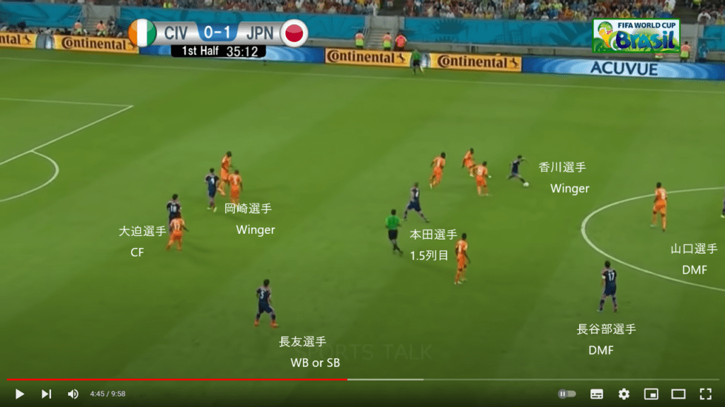 Wingersが自由なので、コートジボワール代表は守備に人数を割かないといけませんし、なので1.5列目の本田選手に香川選手はボールを預けますし、それによって、本田選手のゴールが誘発されるんです。