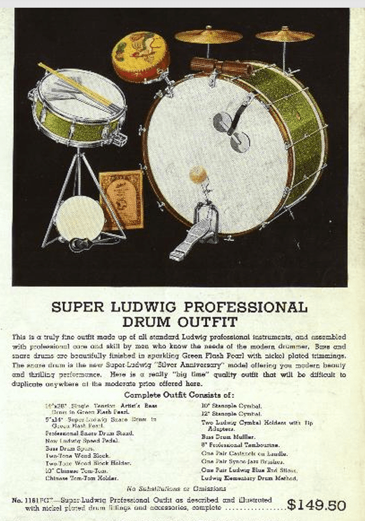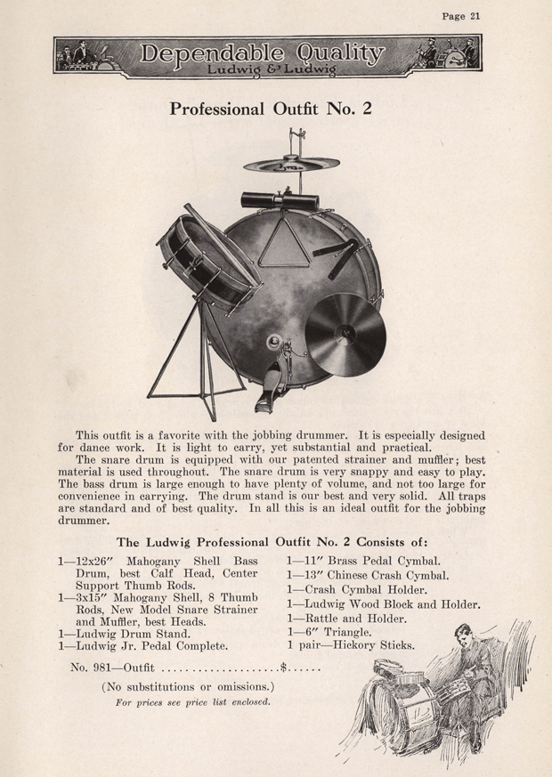 1922年には、基本のドラムセットが存在をして、既製品もしくは注文品として販売されていたことになります。”outfit”と記載があるので、一式でドラムセットとして発売されていたみたいです。