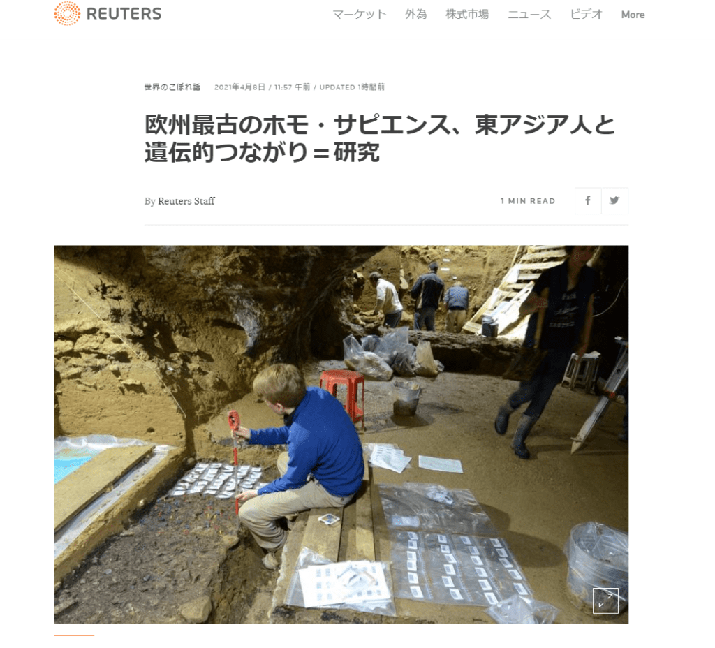ロイター通信の「世界こぼれ話」では、実は結構重要なんじゃないの?というニュース報道がありました。アジアへ向かった現世人類とネアンデルタール人の間に交配があった可能性があるというニュースなのだとは思いますが。報道内容がおそらく先走りすぎていて事実は伝えてないような気がします。