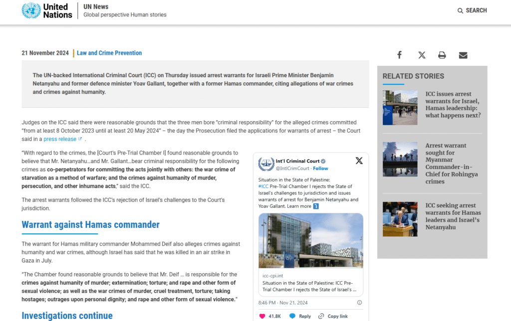 イスラエルのネタニヤフさんによるガザでの殺戮行為については、国連がICCによる訴状が出ていることを公式サイトに掲載しています。