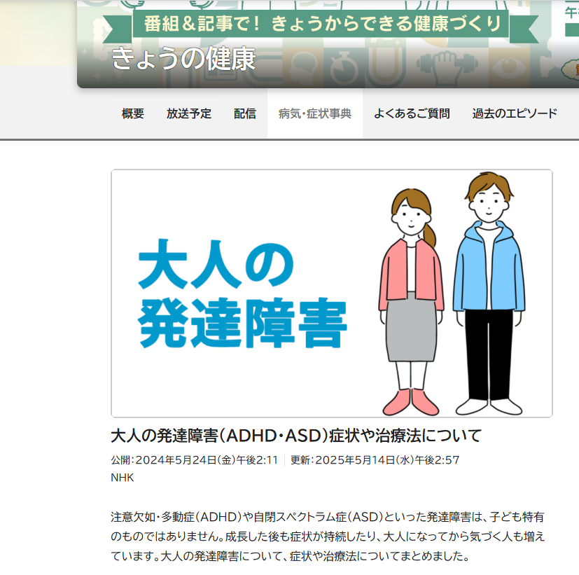 Eテレの「きょうの健康」です。医師の監修が入っているはずだと思うんですが。ICD-11の診断基準をきちんと認識しているとは思えないんです。わたしはASDでもADHDでもないですよ。18歳までにごく普通の成長をしましたから。