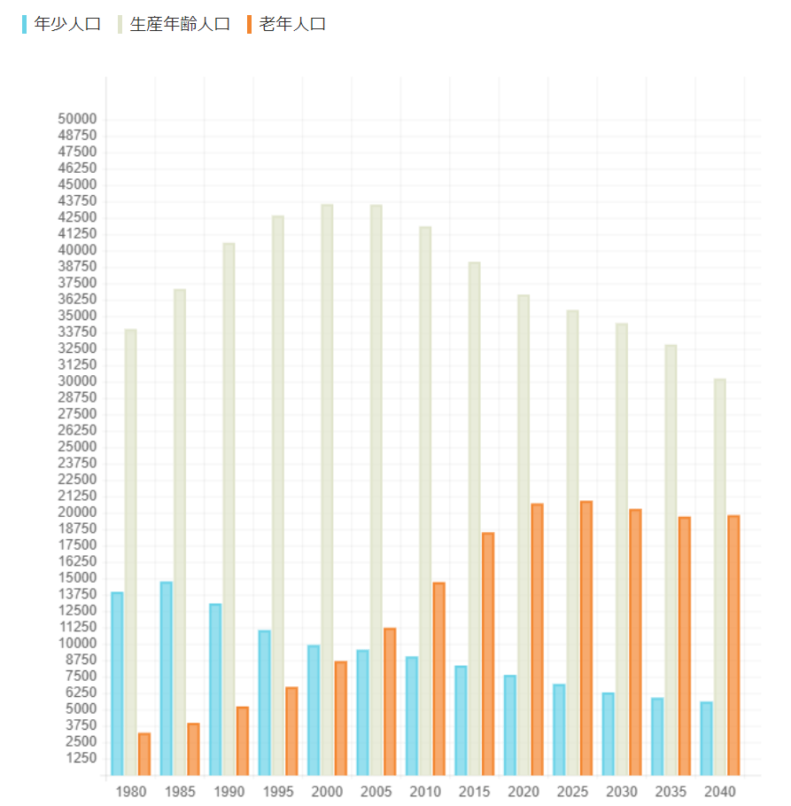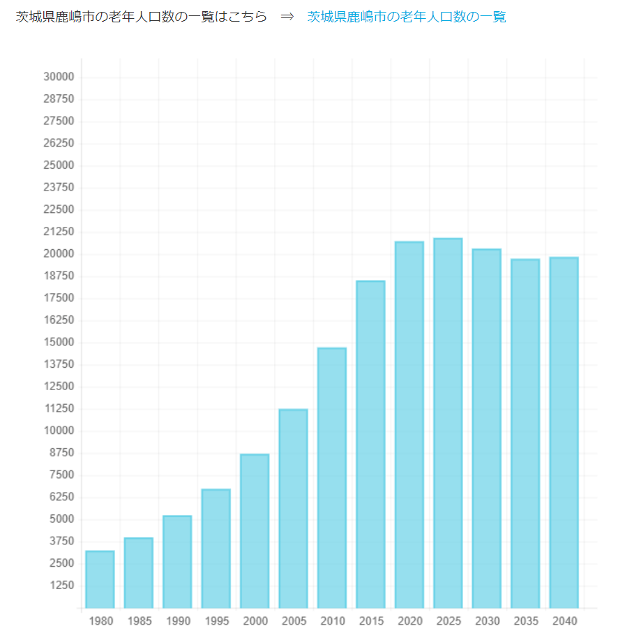 2015年から数値があまり変わらないことにお気づきになるかとも思います。この背景には鹿嶋市の人口減とその中での老年人口の増加という、日本の自治体が普遍的に抱えている問題が浮き彫りになります。