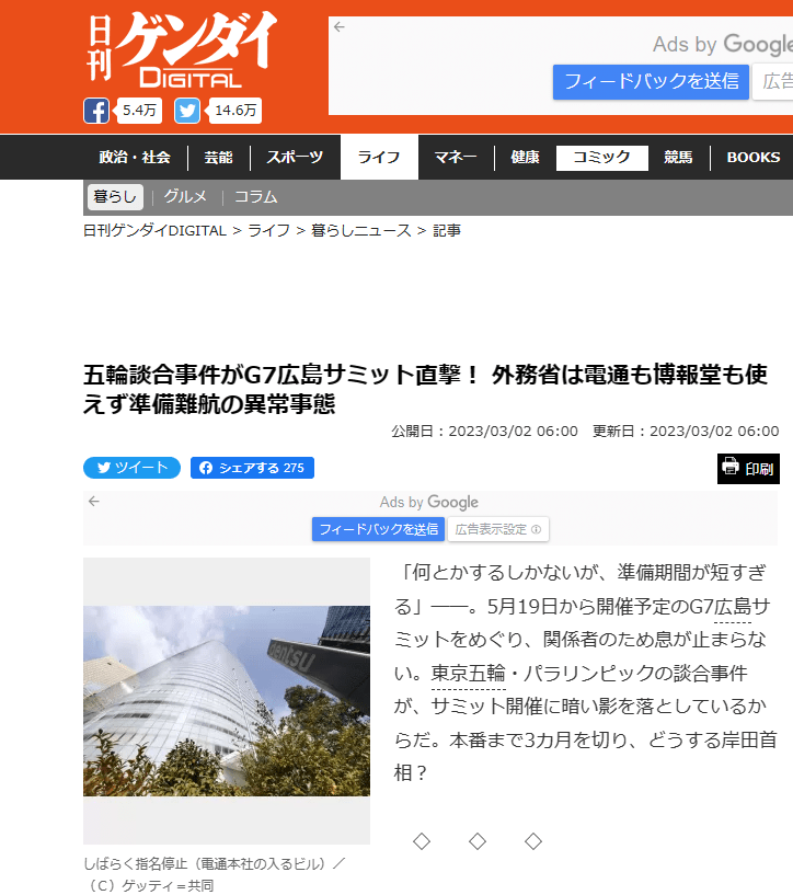 「2016年のG7伊勢志摩サミットや19年のG20大阪サミットで、会場設営や会場に出入りする関係者の識別証の管理、日本PRスペースの運営といった広報業務などの元請けを担ったのは、電通グループ。発注元の外務省にすれば、サミットの一部業務は電通頼みのスキームが構築されていたのです」(大手代理店関係者)